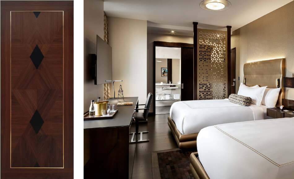 Autograph Collection 是萬(wàn)豪集團(tuán)旗下的高端精品酒店品牌,此項(xiàng)目的業(yè)主方將一座有 200 年歷史的老建筑改造成一家Autograph Collection 酒店。由于政府要求保留這座建筑內(nèi)部的歷史元素,建筑師設(shè)計(jì)了一款非常有特色的木門,設(shè)計(jì)的靈感來自于建筑內(nèi)電梯間的金屬裝飾圖案。